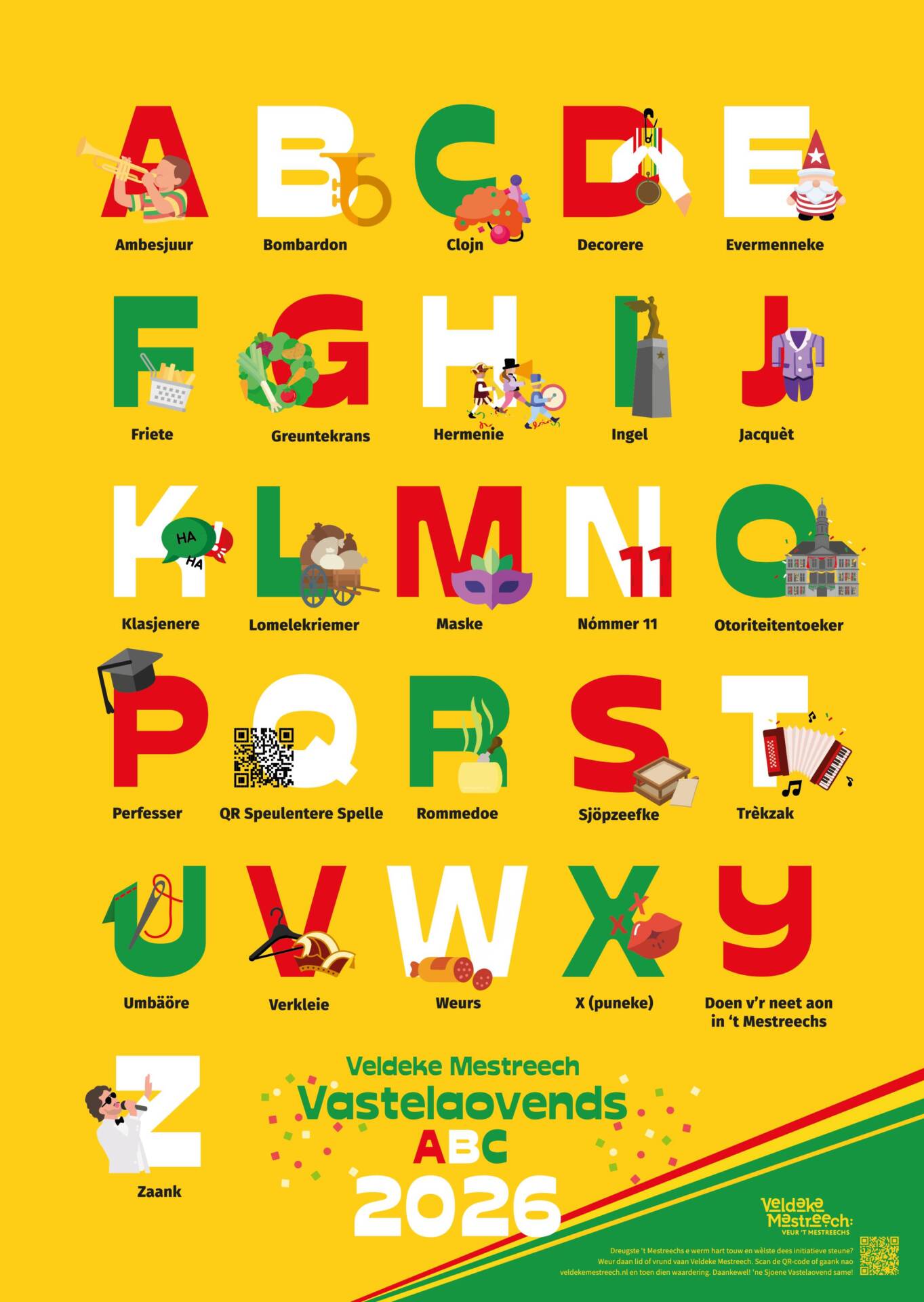 Na het grote succes van het Veldeke Vastelaovends ABC vorig jaar lanceert Veldeke Krink Mestreech dit jaar de 2026 editie van de gratis verkrijgbare Veldeke ABC poster, mét nieuwe woorden.